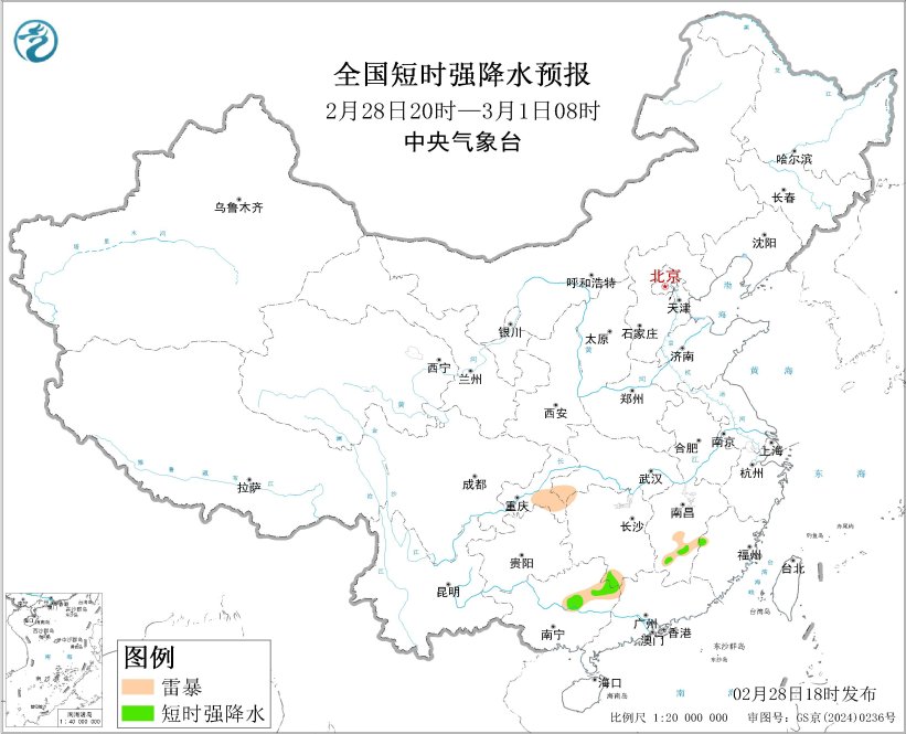 预计2月28日20时至3月1日20时,湖南南部、江西中南部、福建西北部、广西东北部、广东西北部等地的部分地区将有短时强降水天气,小时雨量20-40毫米,局地可达40毫米以上;另外,重庆东南部、湖北西南部、湖南南部、江西中南部、福建中西部、广西东北部、广东西北部等地的局地将有雷暴。